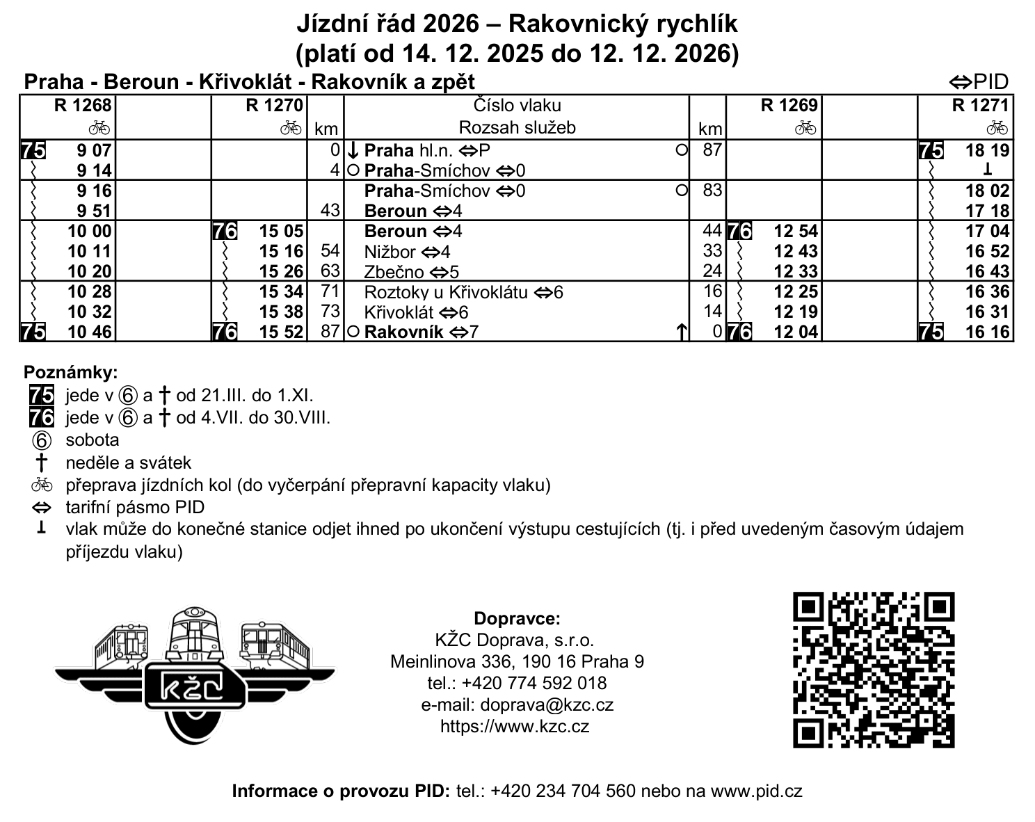 Rakovnický rychlík jezdí údolím řeky Berounky a Rakovnického potoka v trase z Prahy přes Beroun, Křivoklát do Rakovníka a zpět a to každou sobotu, neděli a státní svátek od posledního březnového víkendu do konce října. Souprava vlaku je složena z legendární motorové lokomotivy "zamračená" řady T 478.1 a elegantních osobních vozů ze 60. let řady Bmx. Kapacita vlaku je 176 míst k sezení a cca 10 jízdních kol. Kola, kočárky a zavazadla se přepravují ve vyhrazeném prostoru v oddílech pro cestující. Popis trasyRychlík vyjíždí ráno z Prahy hlavního nádraží proti proudu řeky Berounky. Pod kulisou hradu Karlštejn dojede do Berouna. Zde se odpojí od hlavní tratě vedoucí na Plzeň a pokračuje přes Nižbor, Zbečno a Roztoky do Křivoklátu. V těchto místech tok Berounky opustí a údolím Rakovnického potoka dojede do historického města Rakovník. Na cestě vlak projede po 5 velkých mostech přes Berounku a Vltavu, tak i celkem 5 tunely. O letních prázdninách Rakovnický rychlík kromě jízdy z Prahy do Rakovníka a zpět vykoná ještě jednu jízdu z Rakovníka (ve 12:04) do Berouna a zpět do Rakovníka (v 15:06). Jízdní řádPřeprava kolVe vlacích linky Rakovnický rychlík je umožněna přeprava jízdních kol. V každém vlaku je možno přepravit nejvýše 10 jízdních kol. Jízdenky, tarif a smluvní přepravní podmínkyV Rakovnickém rychlíku platí